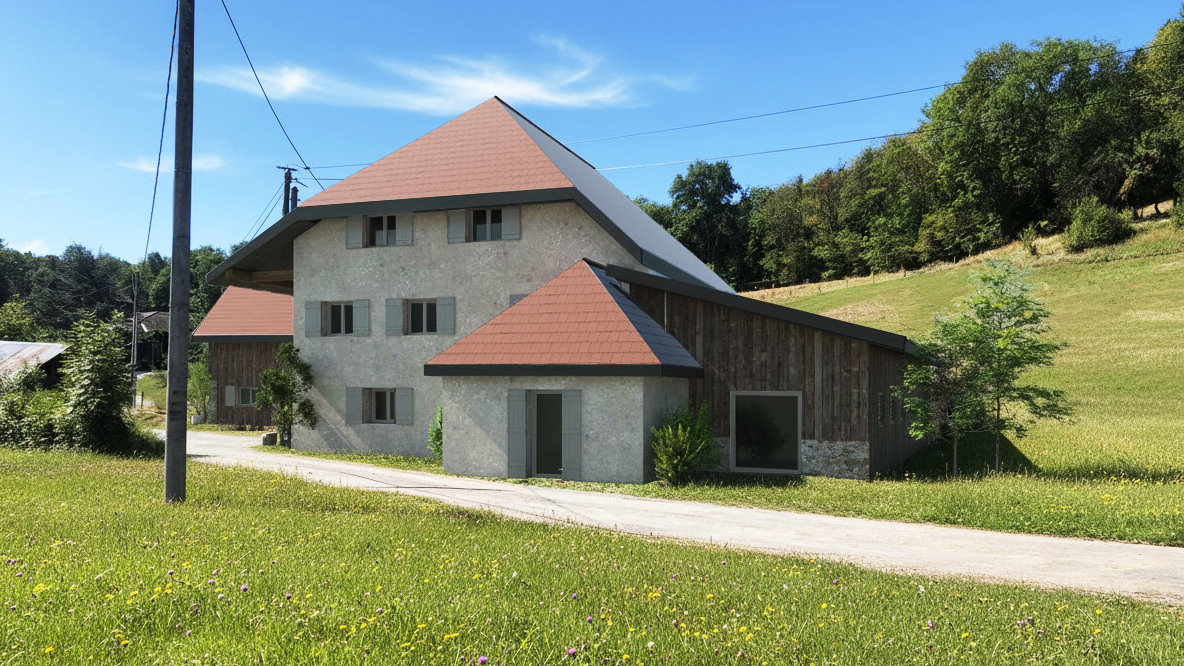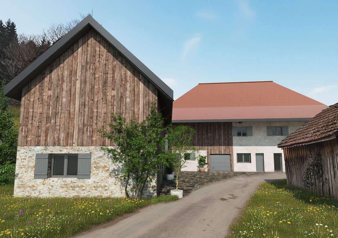 Rénovation écologique d’une grange en pierre avec extension en ossature bois et matériaux de réemploi en Savoie. Un projet durable et performant.